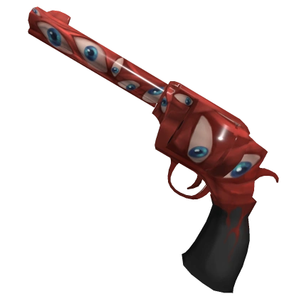 Watcher contains a gradient from a peach red, starting from the barrel, to a darker red, ending around the trigger. Along the red portion of the revolver are eyeballs with light blue irises. The handle is solid black with a little bit of red dripping down onto it.